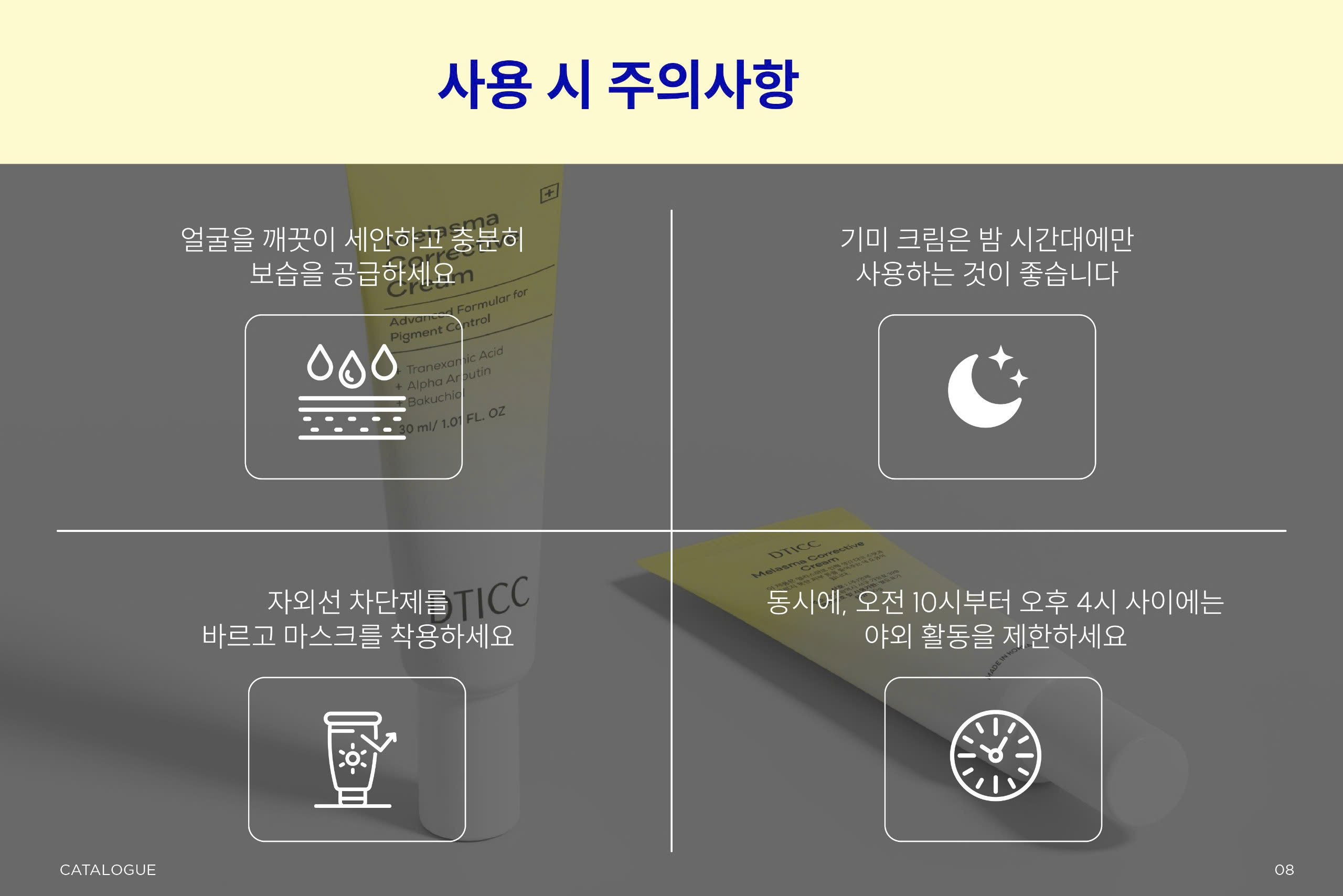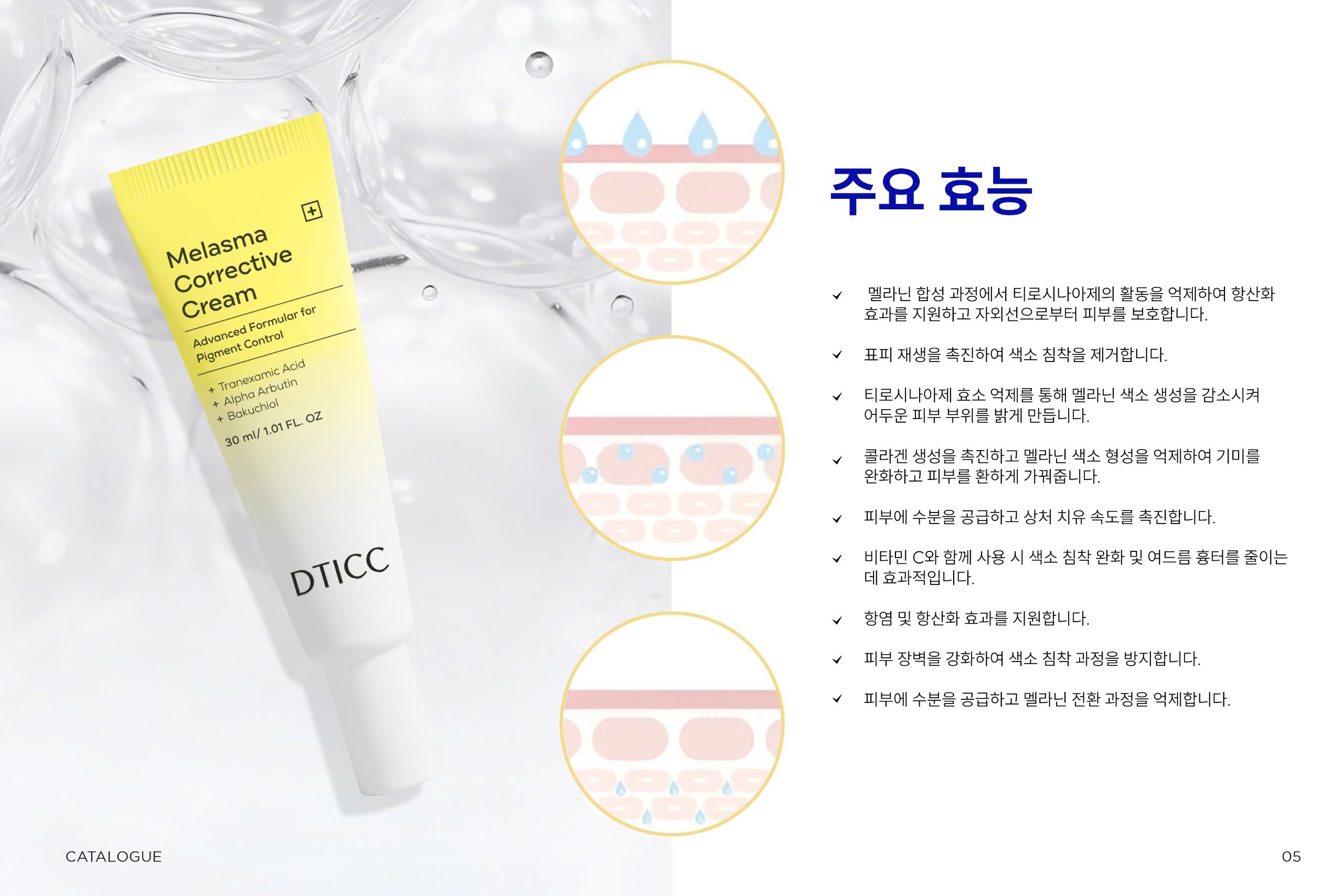 DTICC 기미 개선 밤용 크림 Alpha Arbutin, Tranexamic Acid, Vitamin C 성분이 함유된 부드러운 밤용 크림입니다. 기미, 반점 개선과 피부 톤을 균일하게 만들어주며 수분 공급과 피부 보호까지 동시에 해결합니다. 밤 시간 동안 사용할 수 있는 이상적인 선택입니다.