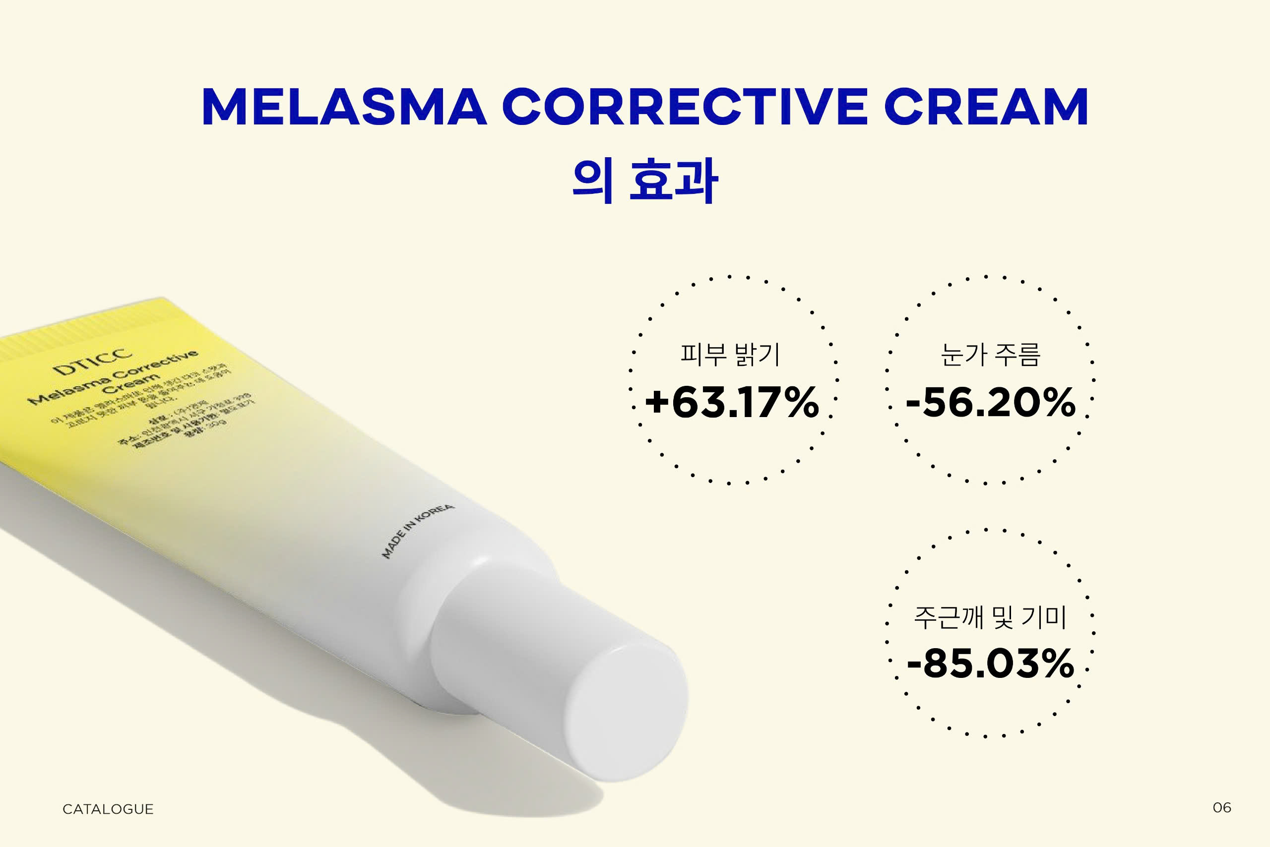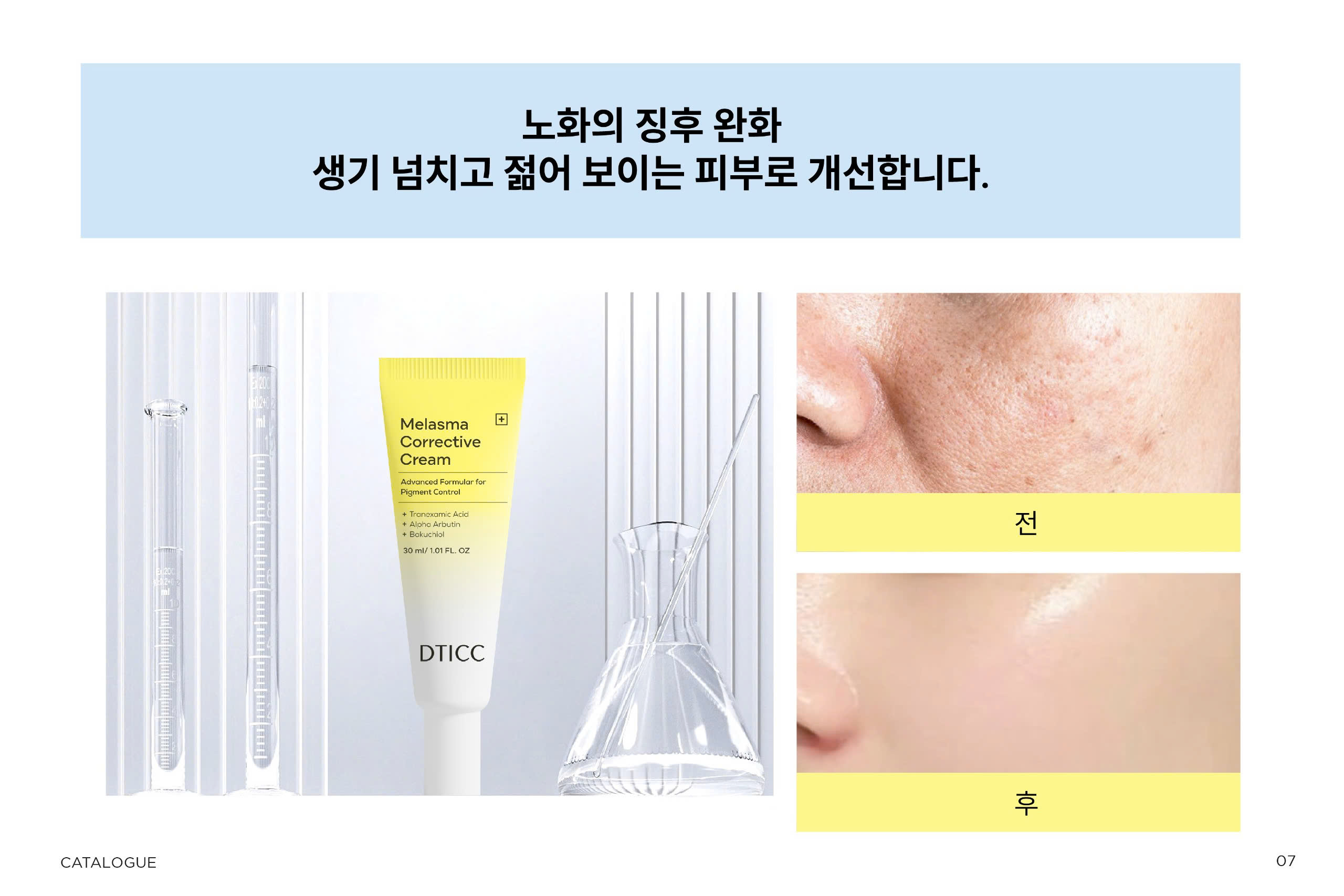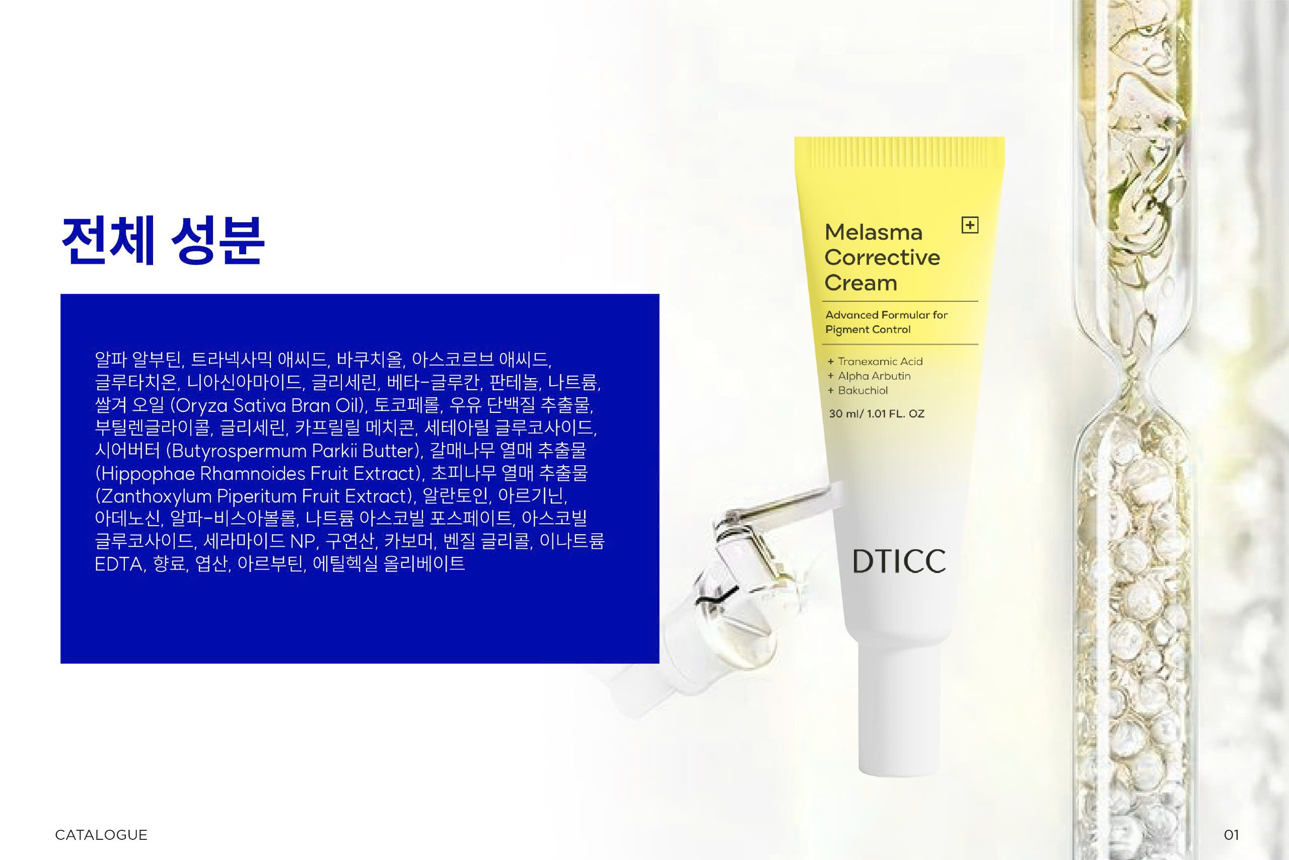 이제는 기미와 불균형한 피부톤에 작별을 고할 시간! 잠자기 전 간단한 스킨케어 단계만으로, DTICC 멜라즈메 교정 크림은 매일 아침 더욱 밝고 고르게 된 피부를 선사합니다. Alpha Arbutin, Tranexamic Acid, Vitamin C의 특별한 조합으로, 이 제품은 기미와 어두운 반점을 완화할 뿐만 아니라 피부에 수분을 공급하고 밤새 피부를 보호합니다. 칙칙한 피부 상태에 머물지 말고, 휴식하는 동안 DTICC 멜라즈메 교정 크림이 작용하게 해보세요.