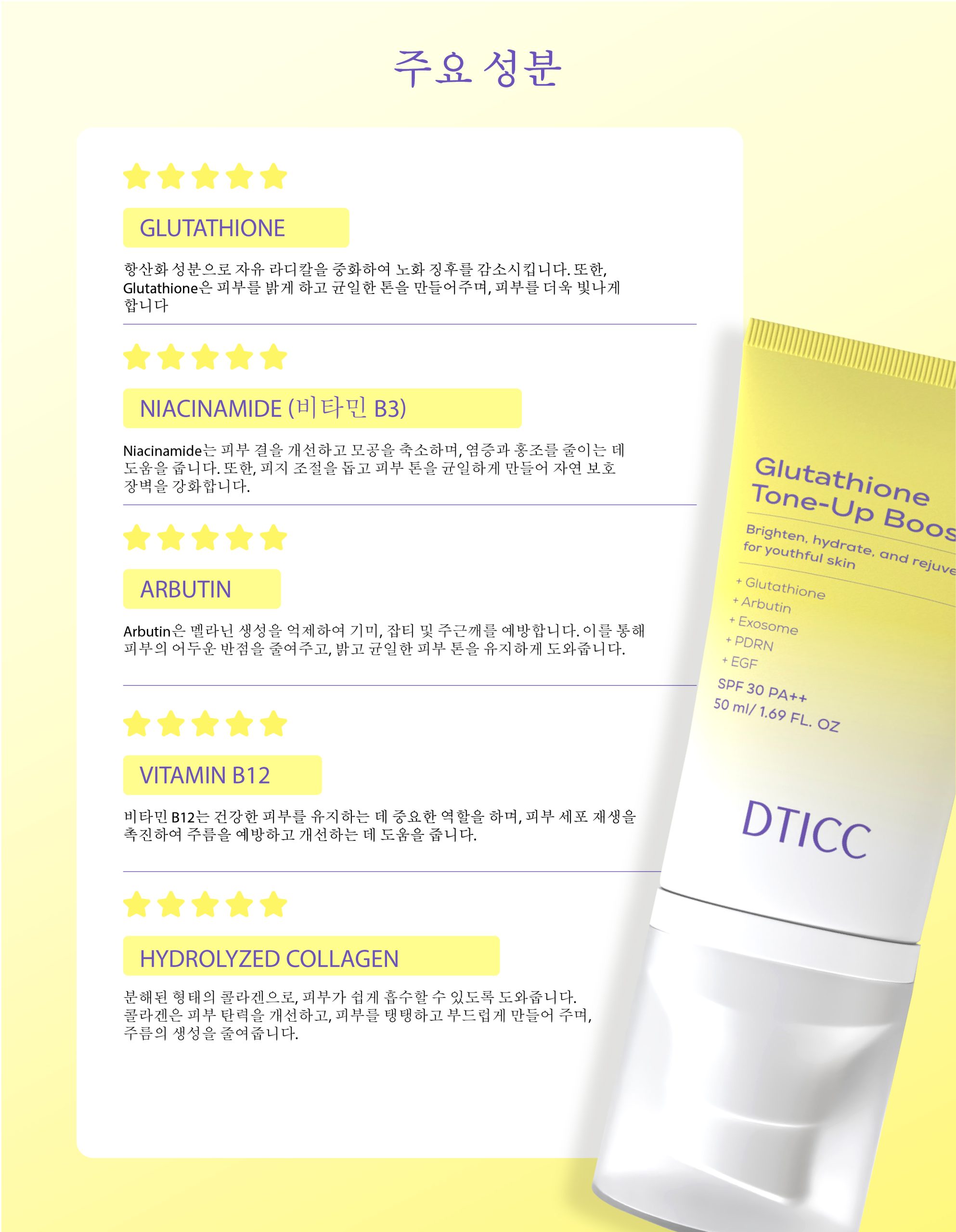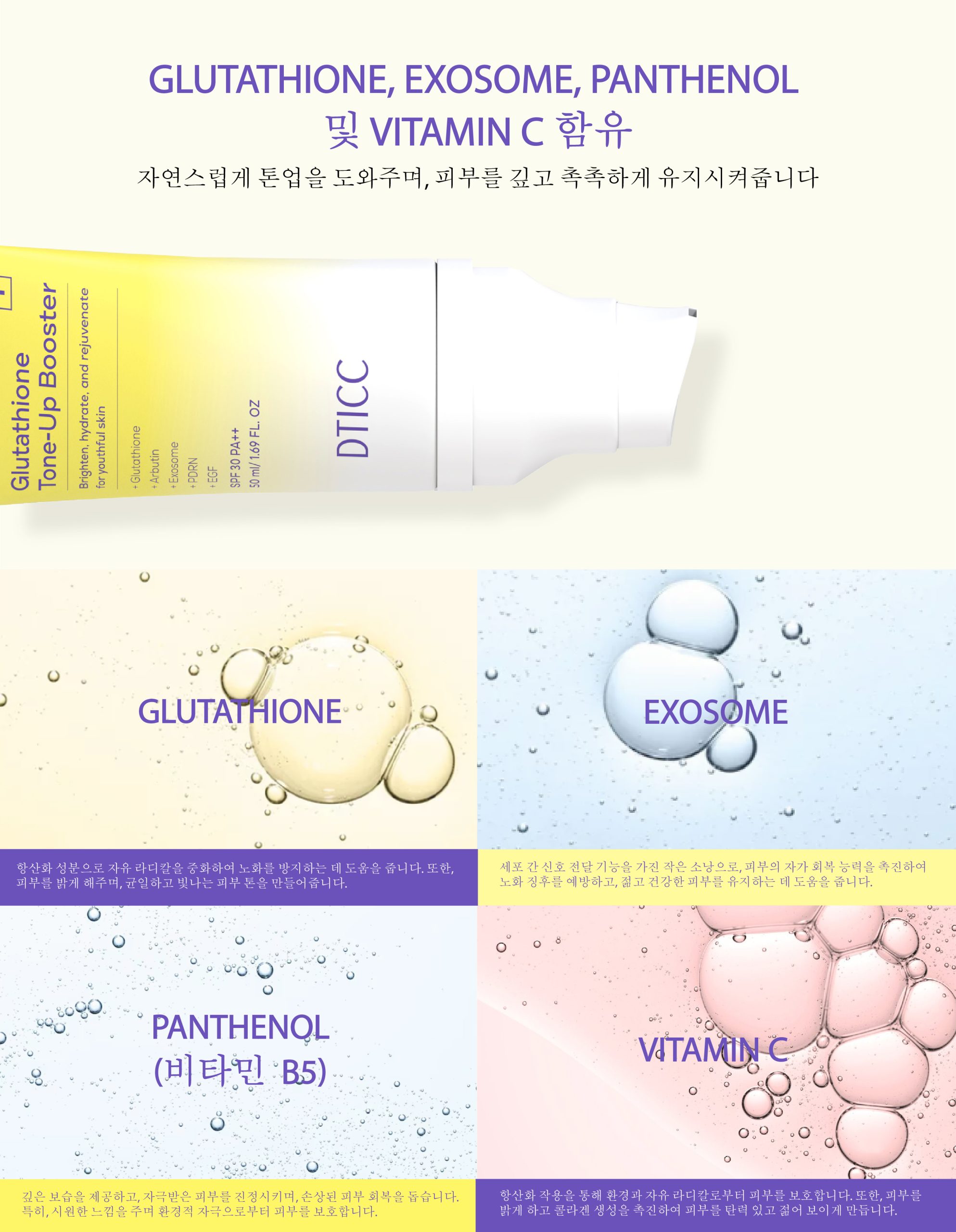 글루타티온: 강력한 항산화제로, 자유 라디칼을 중화시켜 환경적인 피해로부터 피부를 보호하고 피부 톤을 균일하게 만들어 자연스럽고 건강한 밝은 피부를 선사합니다.