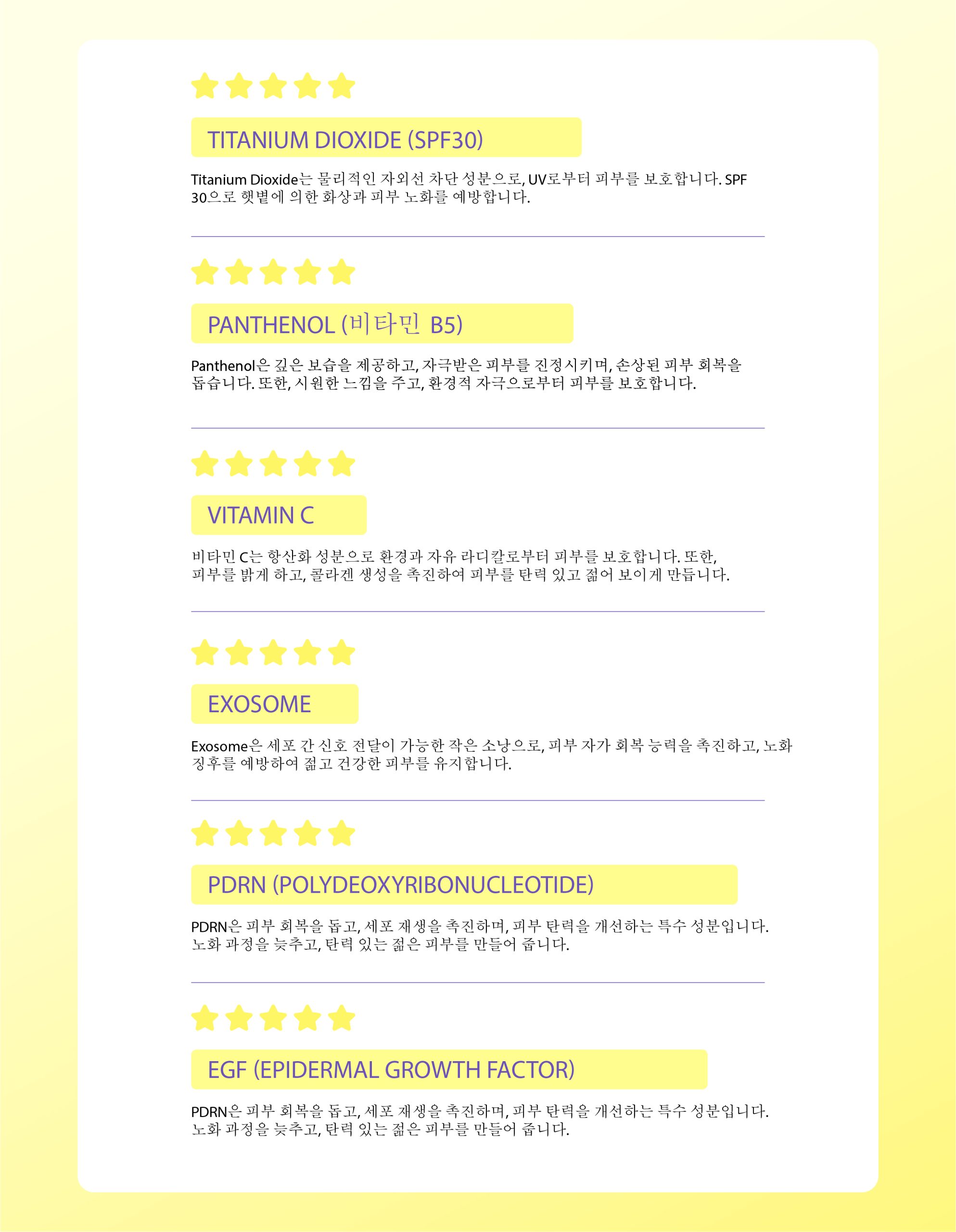 엑소좀: 세포 간 신호 전달을 돕고 피부 회복을 촉진시키며, 노화의 징후를 줄이고 건강하고 탄력 있는 피부를 유지하는 데 도움을 줍니다.