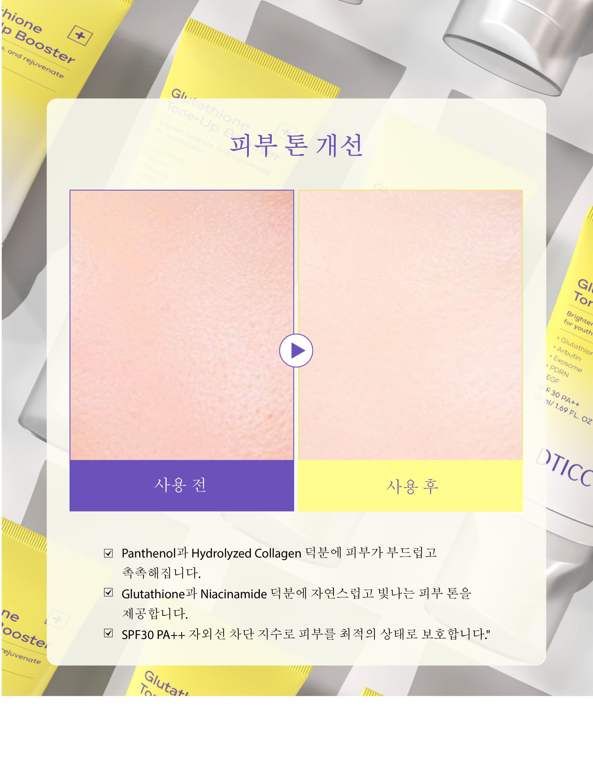 피부 톤 밝히기 및 균일하게 개선: 글루타티온과 니아신아마이드가 함께 작용하여 기미와 잡티를 줄이고 자연스러운 광채를 선사합니다.